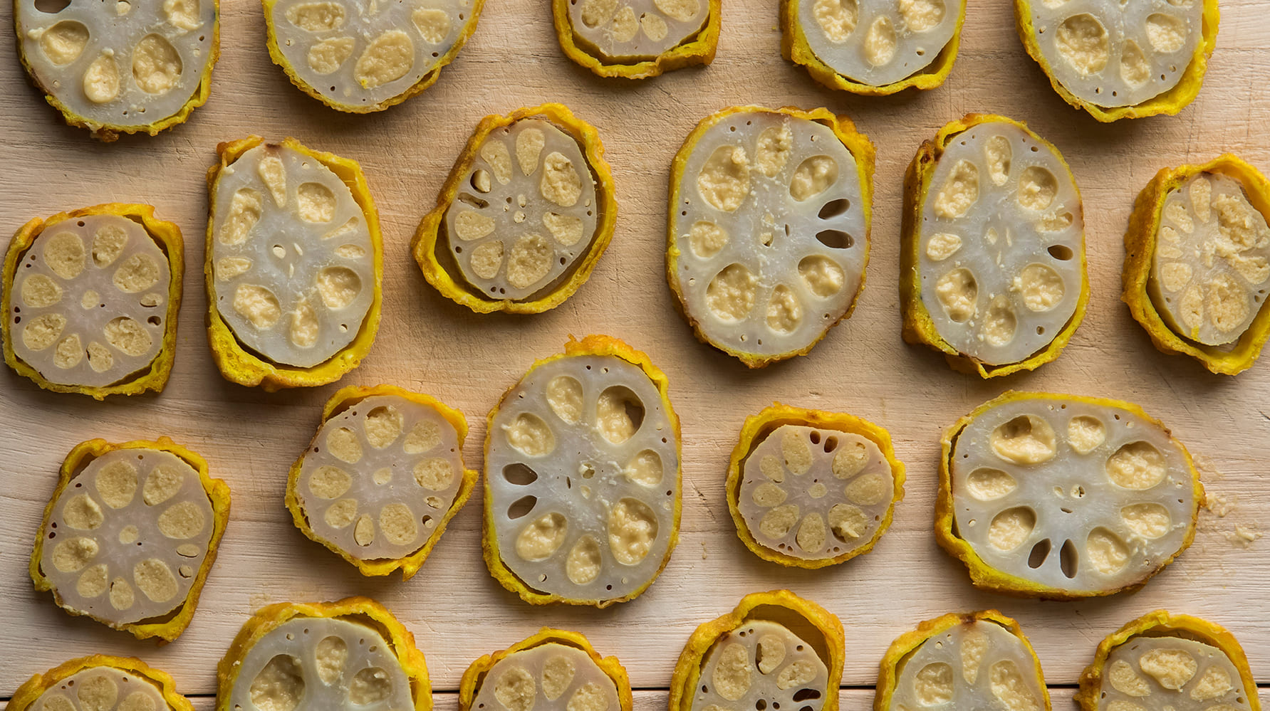 油で揚げずに、焼くチップスもおすすめです。水気を拭き取った蓮根の両面に片栗粉をまぶして油を薄く塗り、170℃で10~15分焼きます。